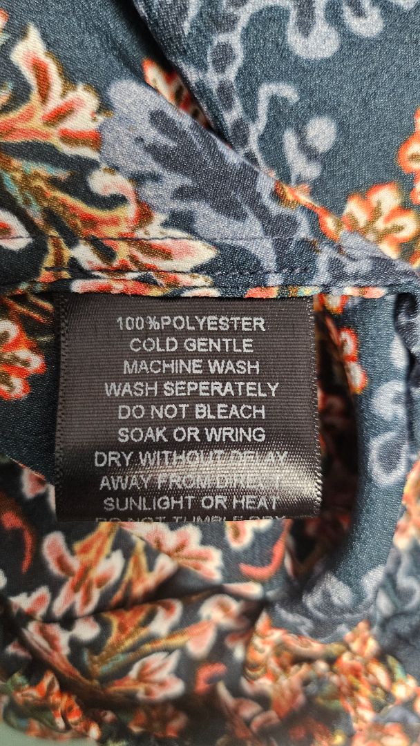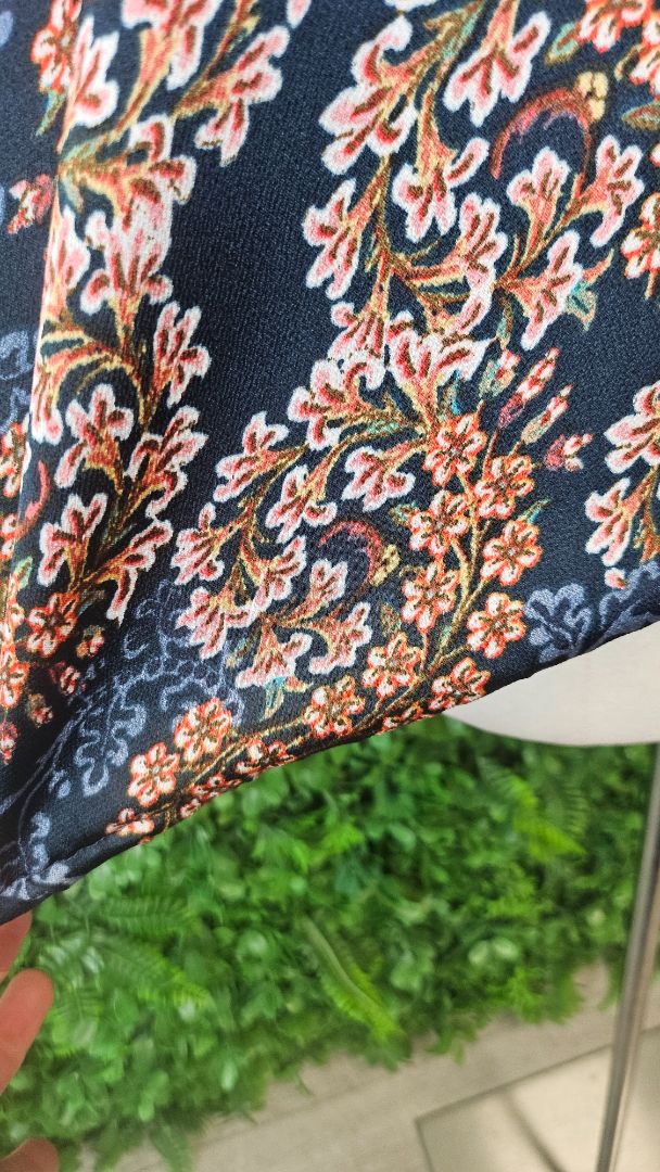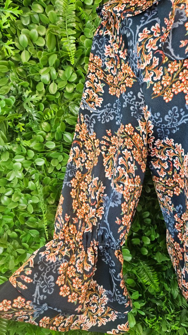 Floral blouse with frill around neck and cuffs. More of a crop length with elastic at the waistband.
