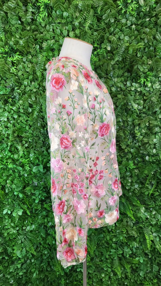 Embrace everyday romance with this stunning blouse, combining delicate floral details on a mesh base.