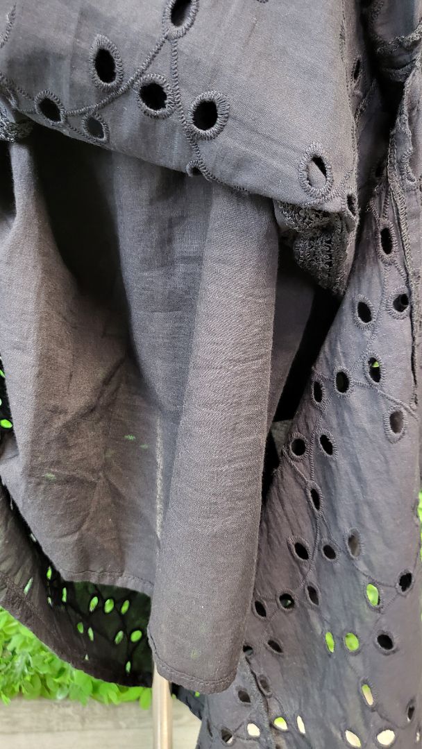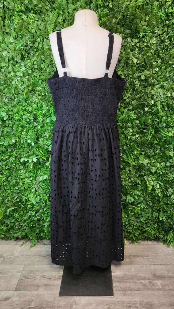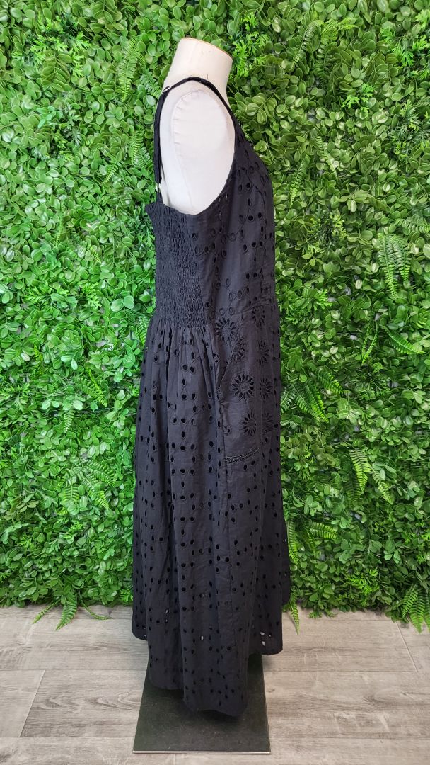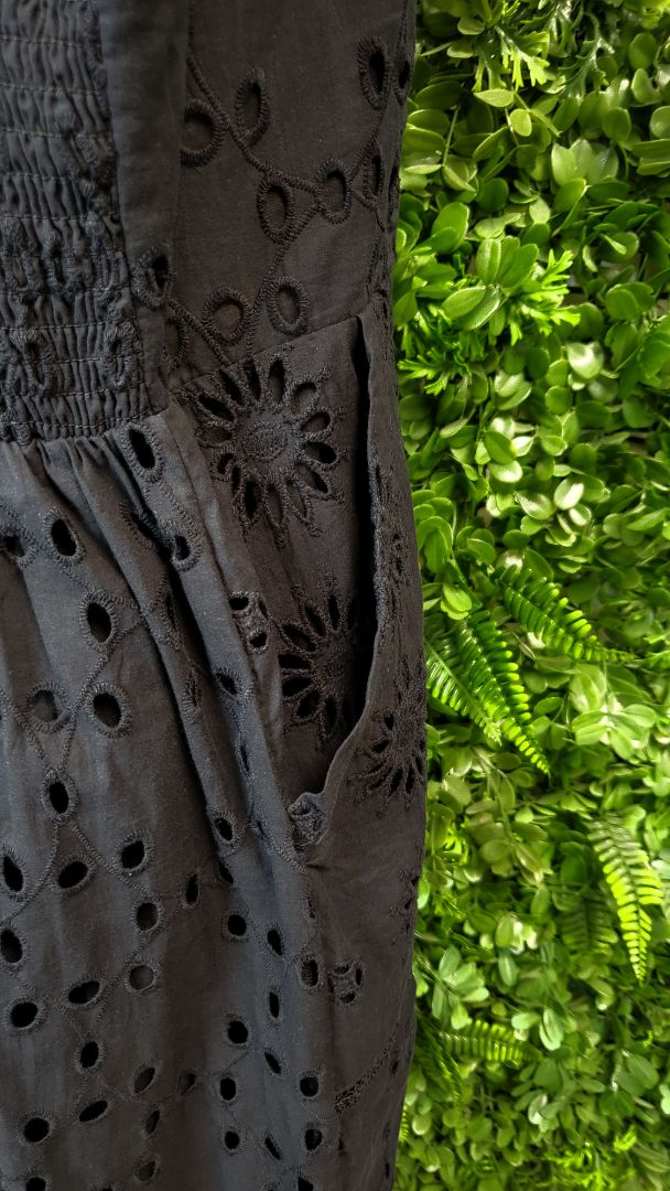 Lovely broderie dress with thick straps, side pockets, elasticated shirred back panel, side split, half lined.