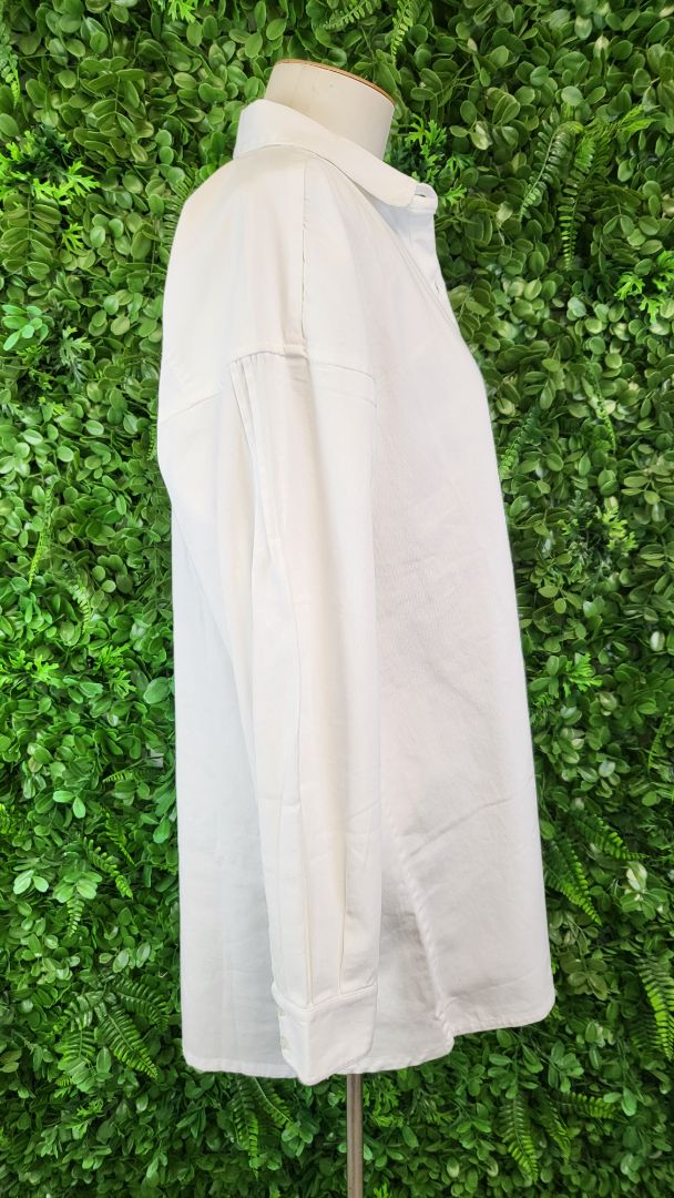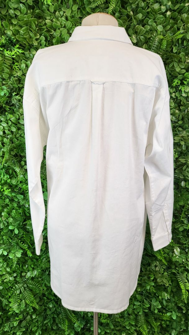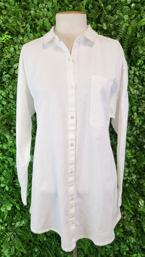 Heavy cotton shirt with a rounded collar and large front pocket.