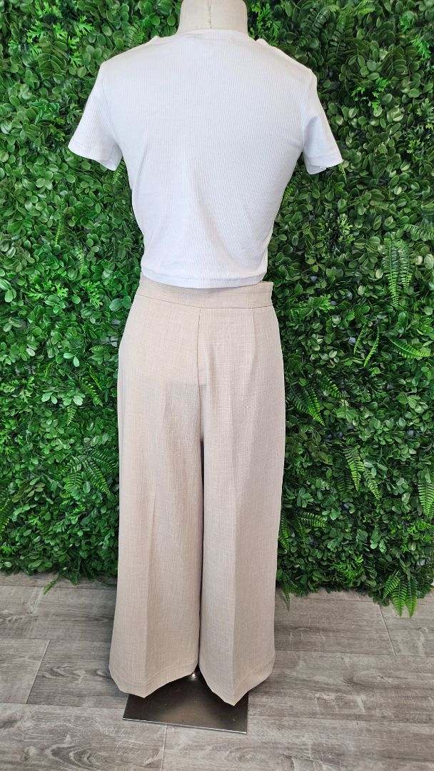 Wide leg pant with front pleats, zip and button closure. Pockets