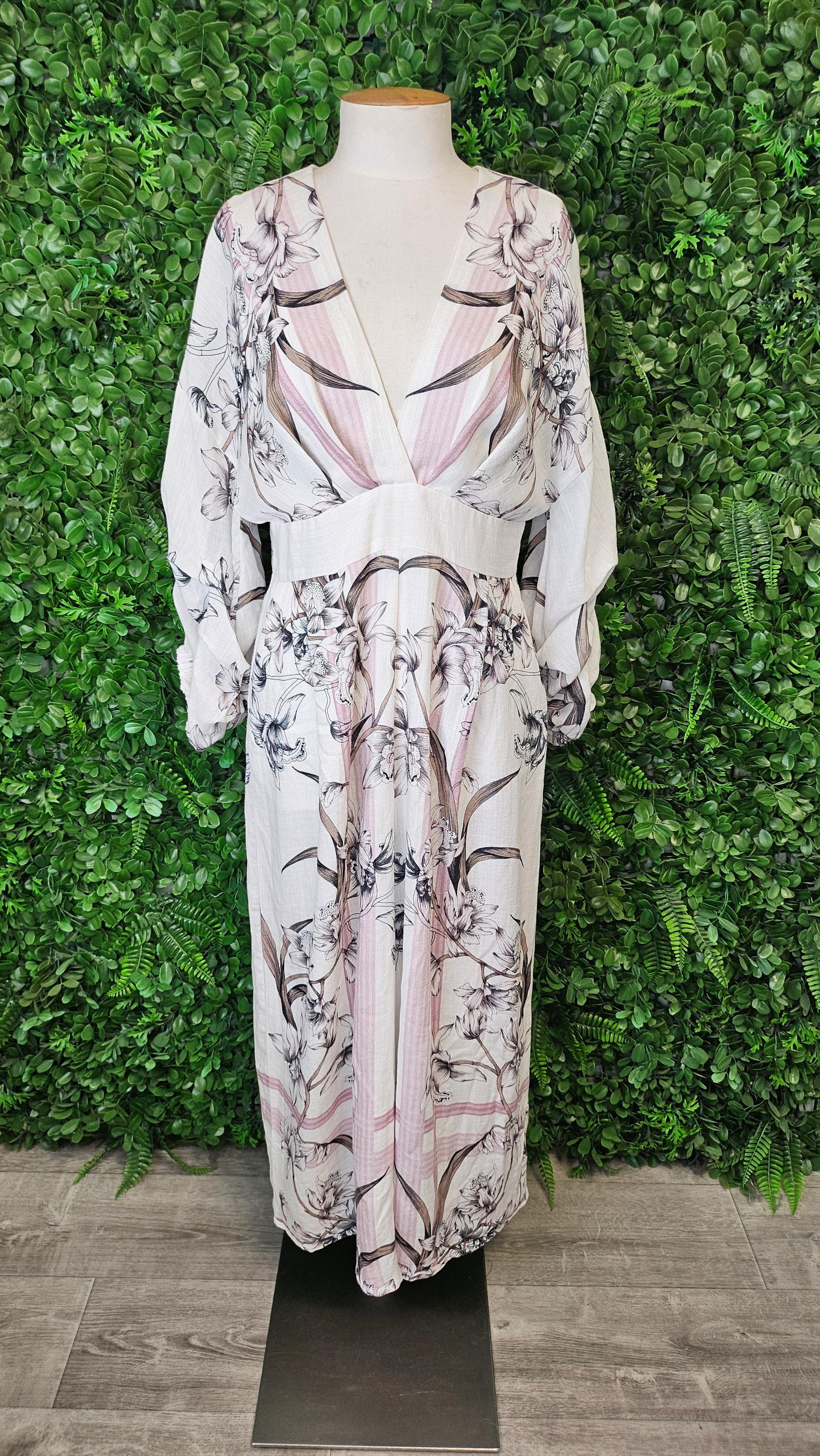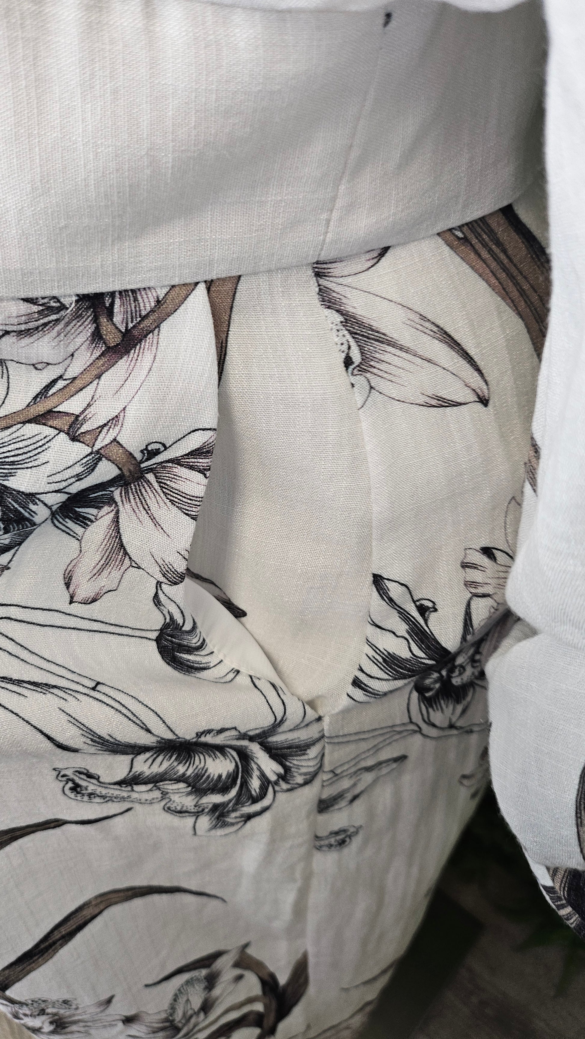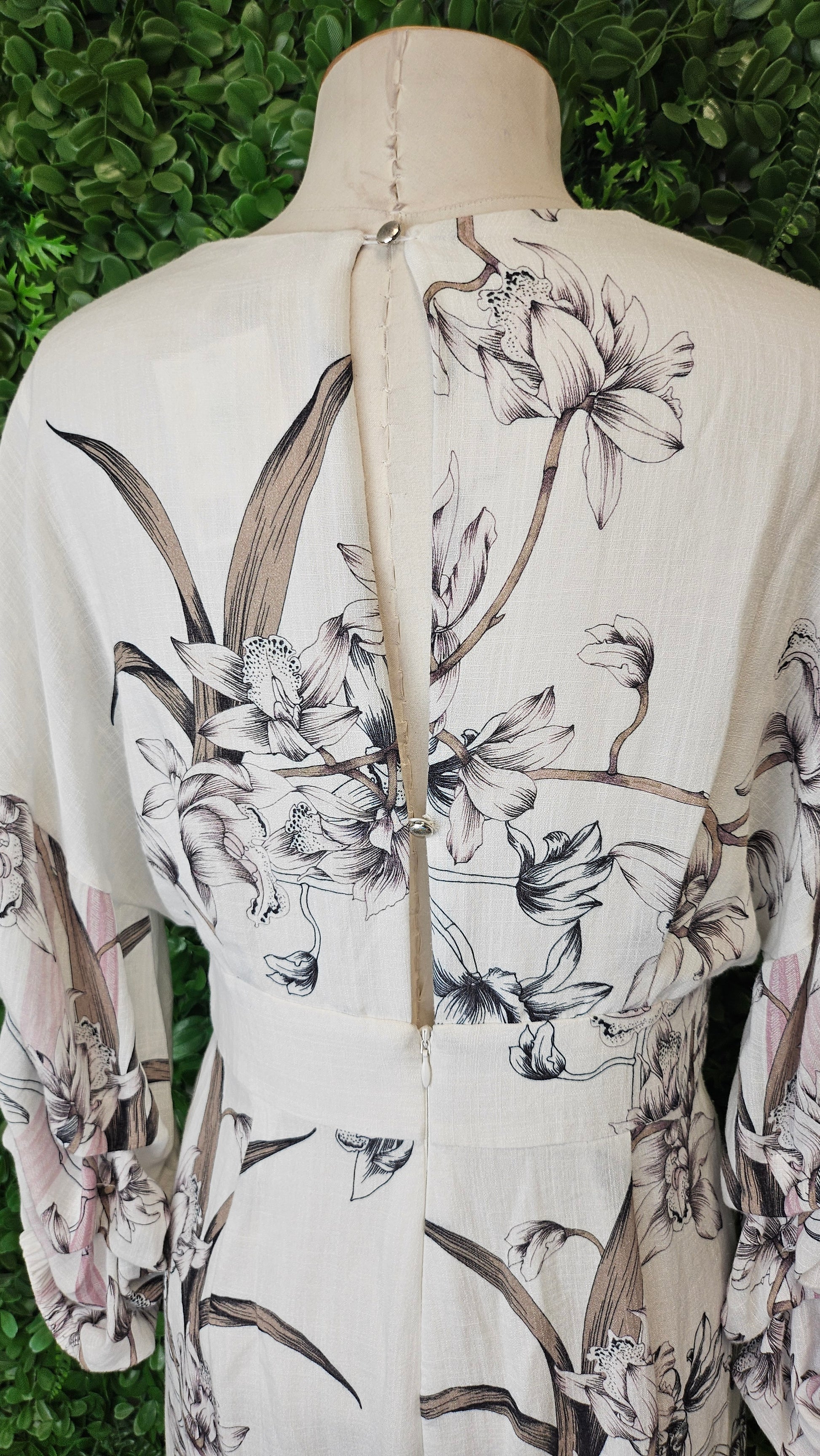 Wide leg jumpsuit with a ruffle 3/4 sleeves, elasticated cuffs, zipper back and buttons.
