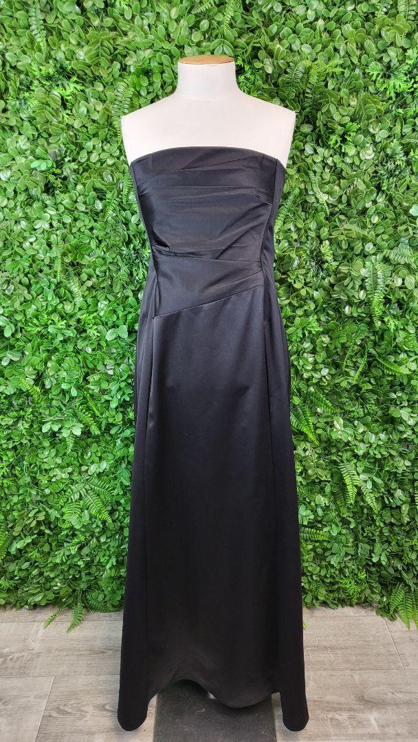 Stretch Sateen strapless dress with a ruched bodice, flared skirt and back zip.