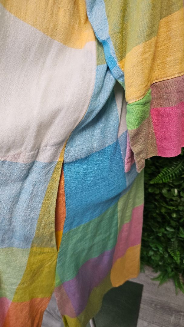 Check tunic top (could also be a dress) with oversized feature shell buttons, pockets and splits at side. Linen blend.