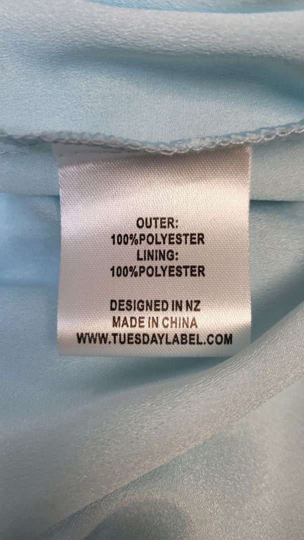 Blue based floral dress with high neckline. Crochet braid insert at waist and cuffs. Lined.
