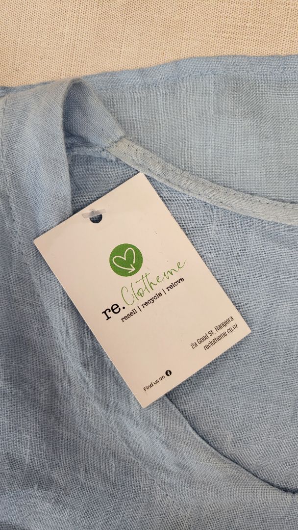 Light weight linen with striped sleeve and side panel gathered seam at bustline.