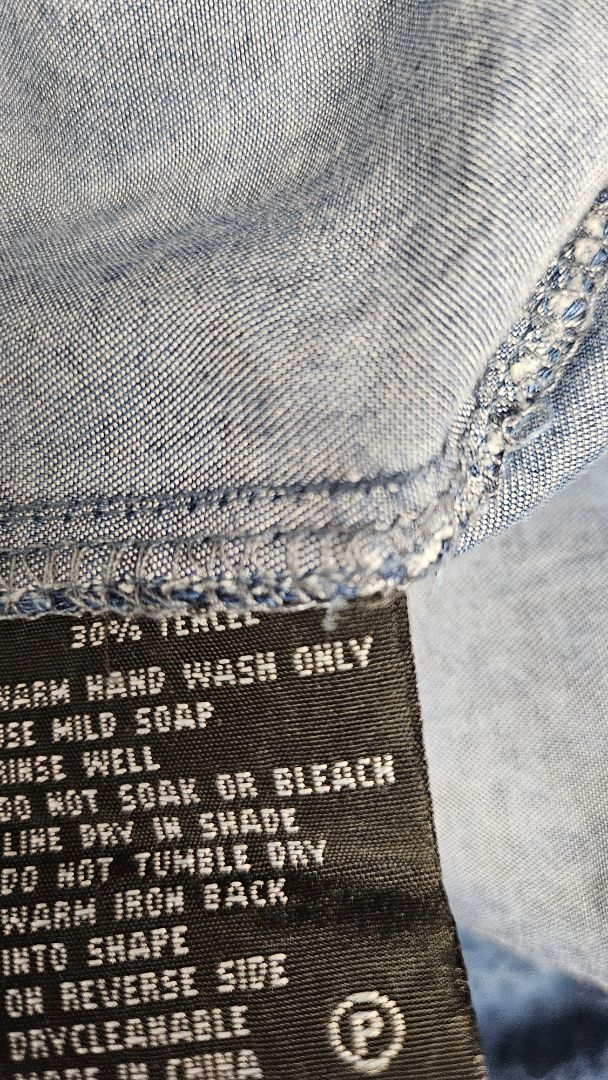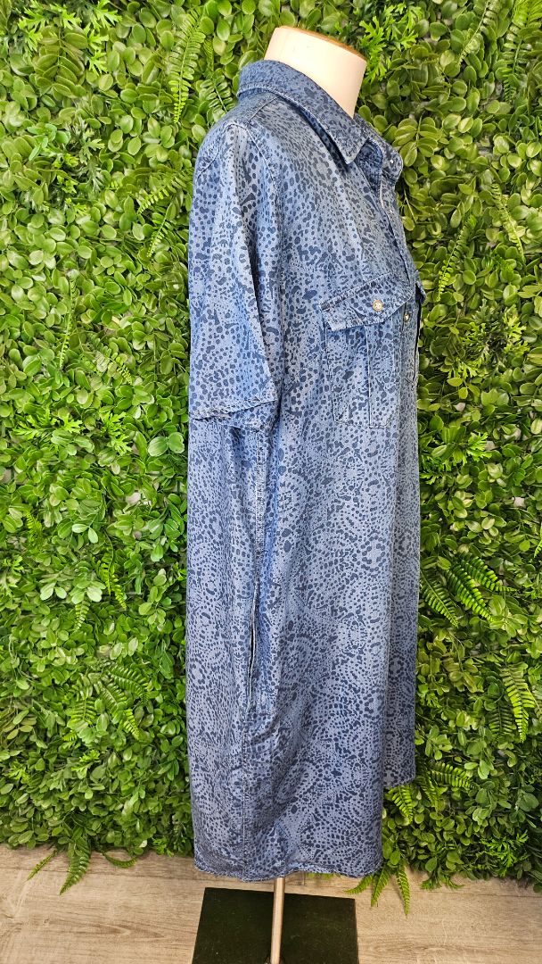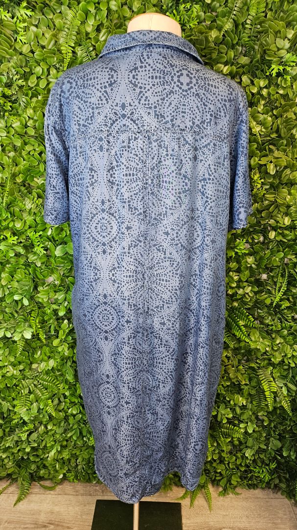 Chambray printed dress with breast pockets, button thru. Curved hemline.