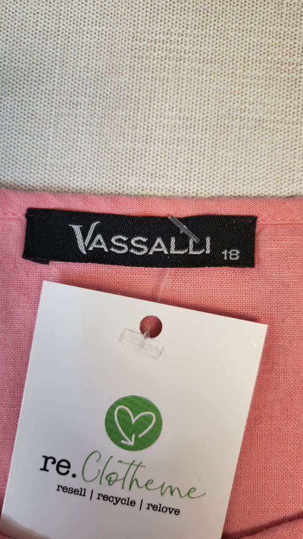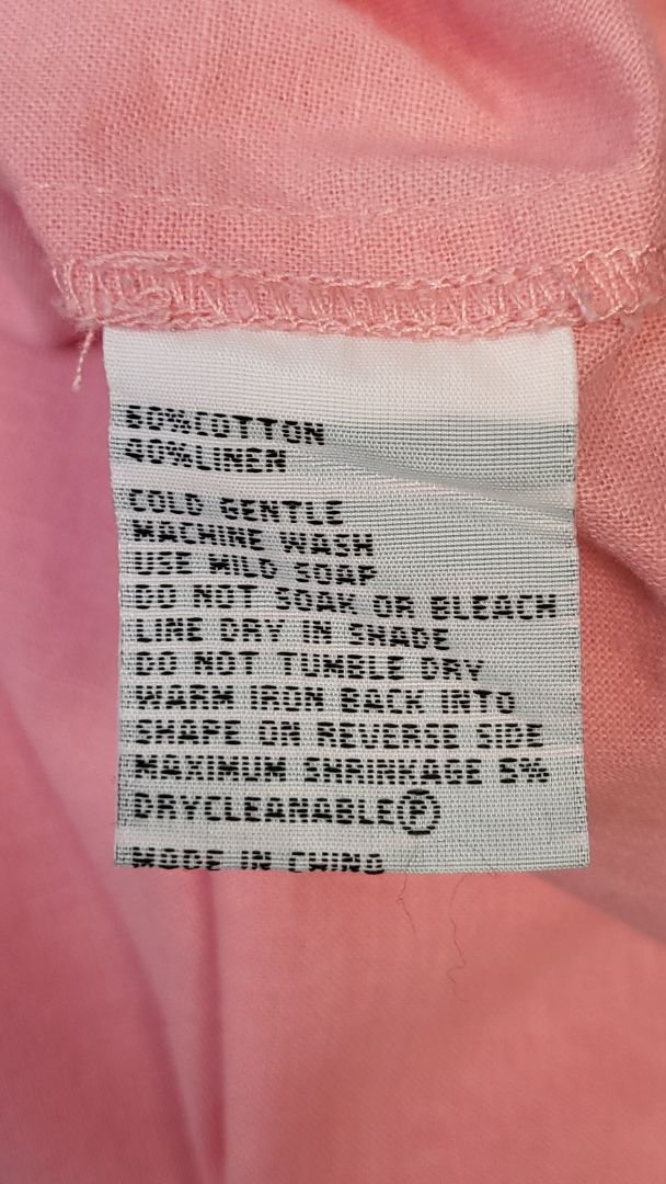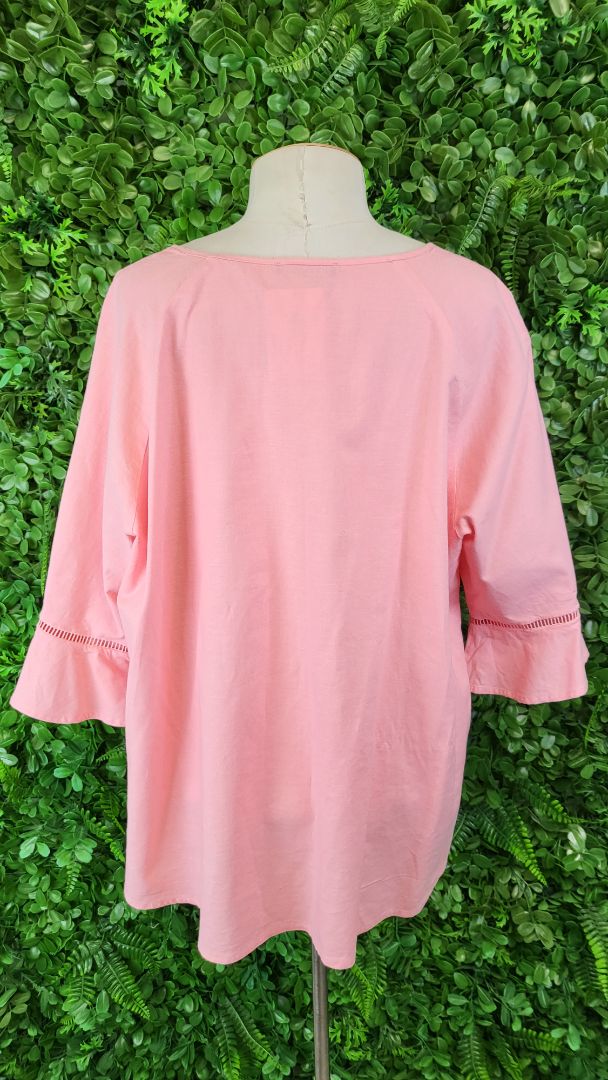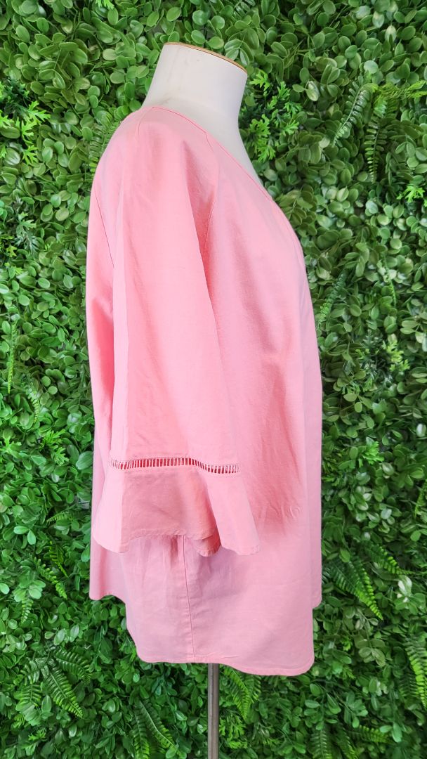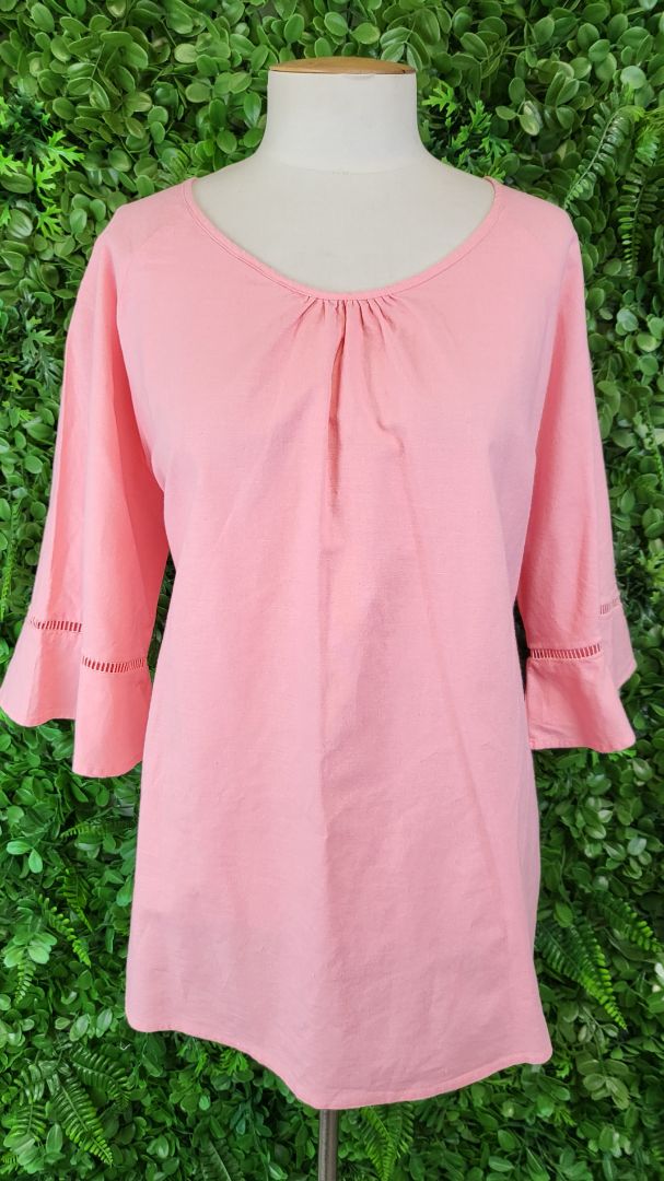 Coral pink top with soft gathers at the neck/ 3/4 sleeve with flutey frill. Linen blend