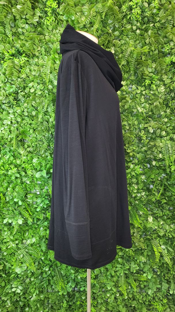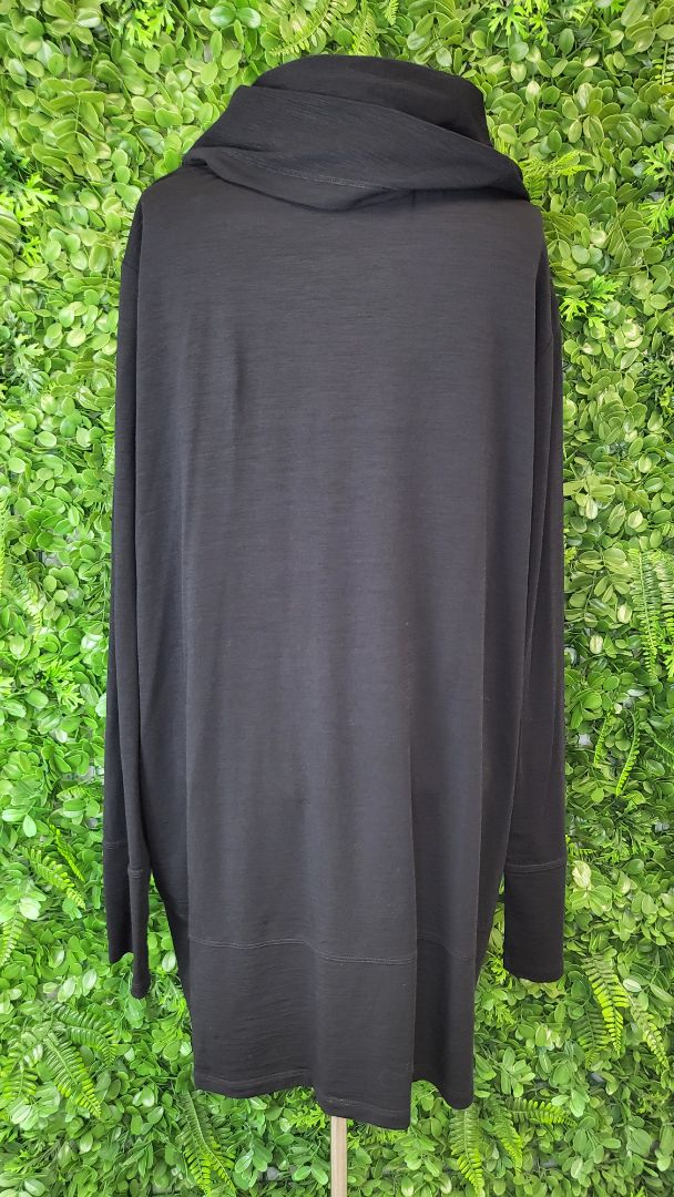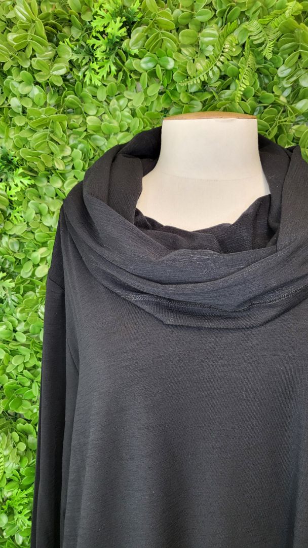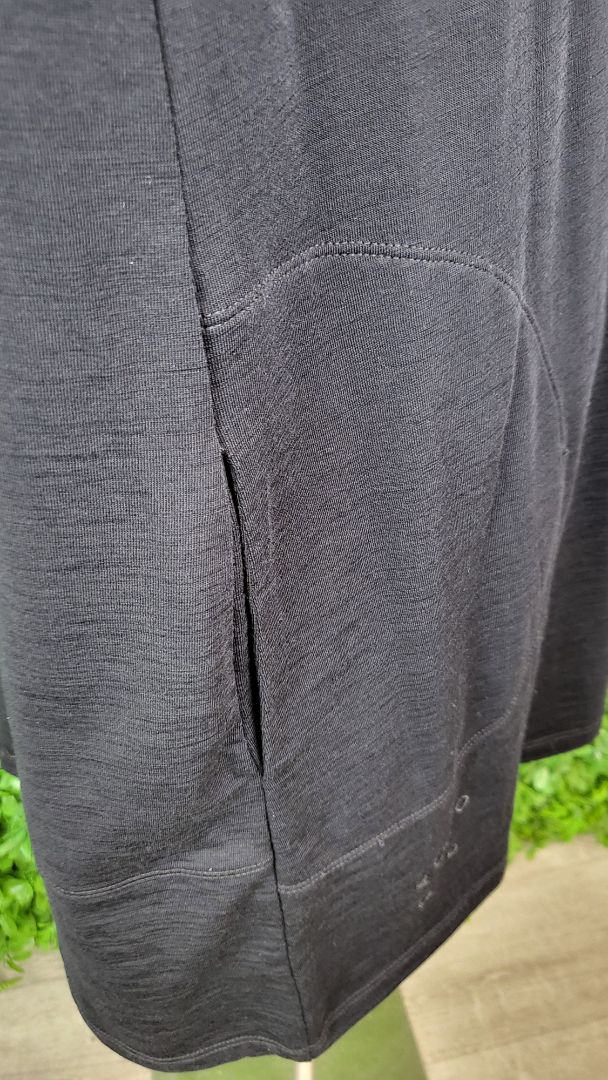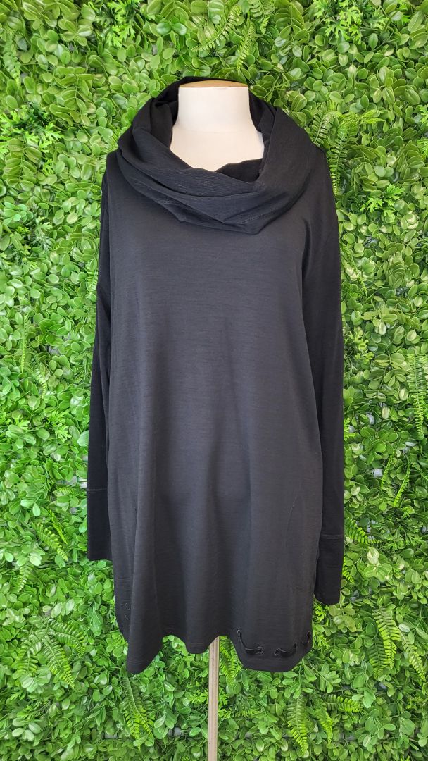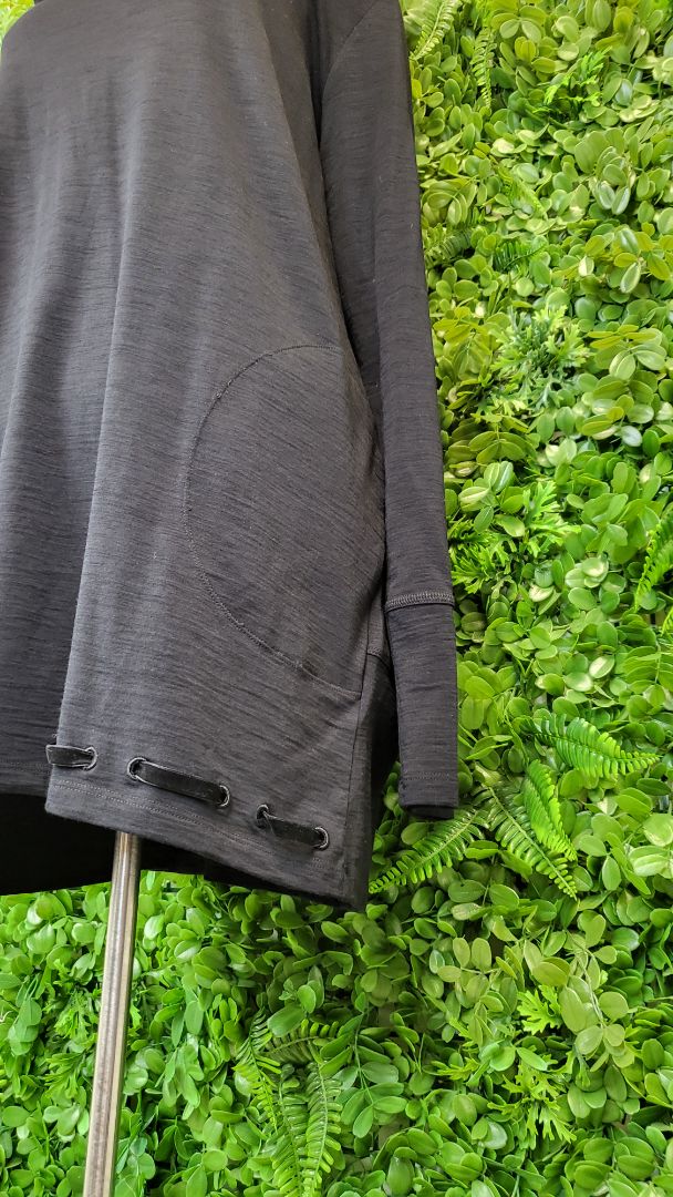 Light weight merino jumper with an generous neckline, side pockets and ribbon detail on hemline.
