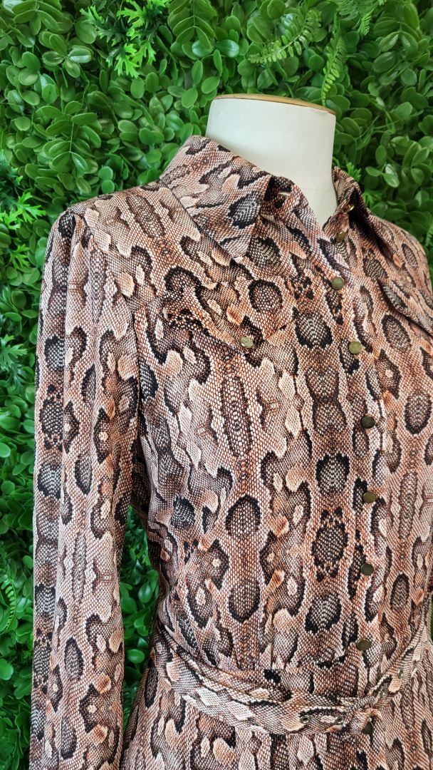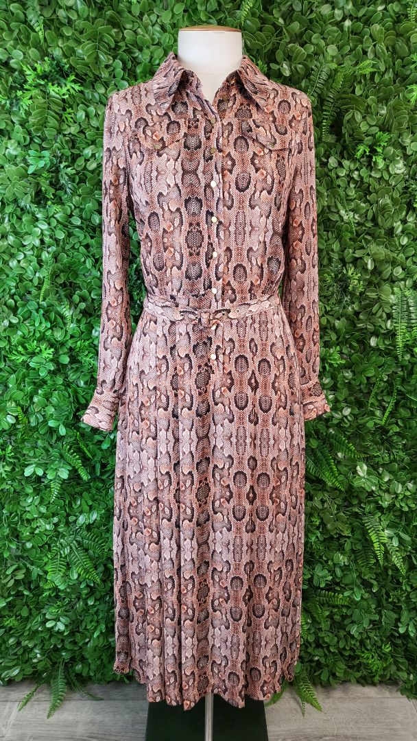 Light floaty shirt dress with gold buttons to half way and fabric belt, side splits and gathering at mid back. 100% Polyester