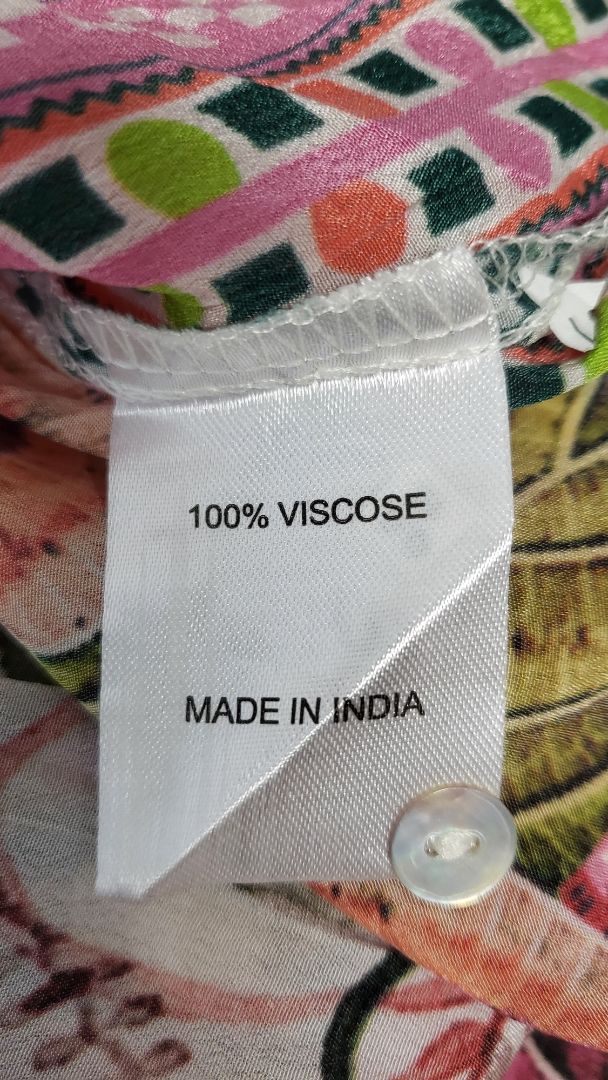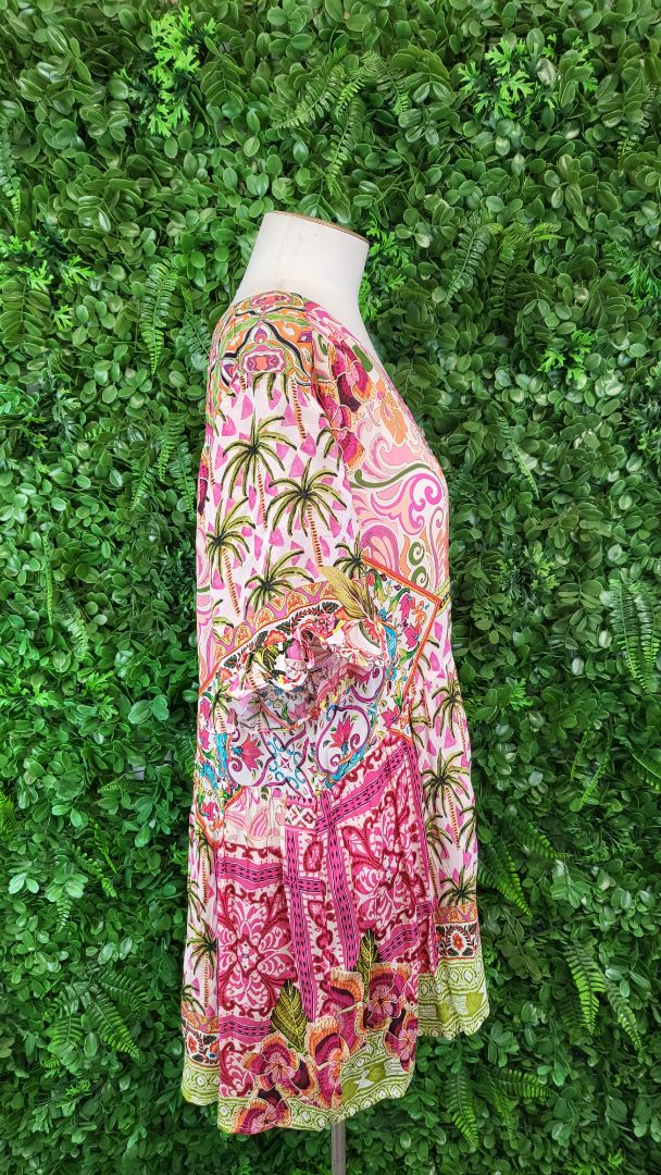 Babydoll style top in tropical print with shell button bodice and frill sleeve