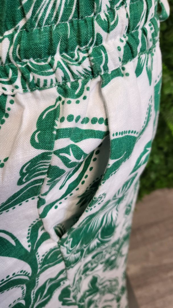 White and green floral pant with wide floaty leg, pull on elasticated waist with drawcord. Pockets. A fun and fresh pant for the summer months