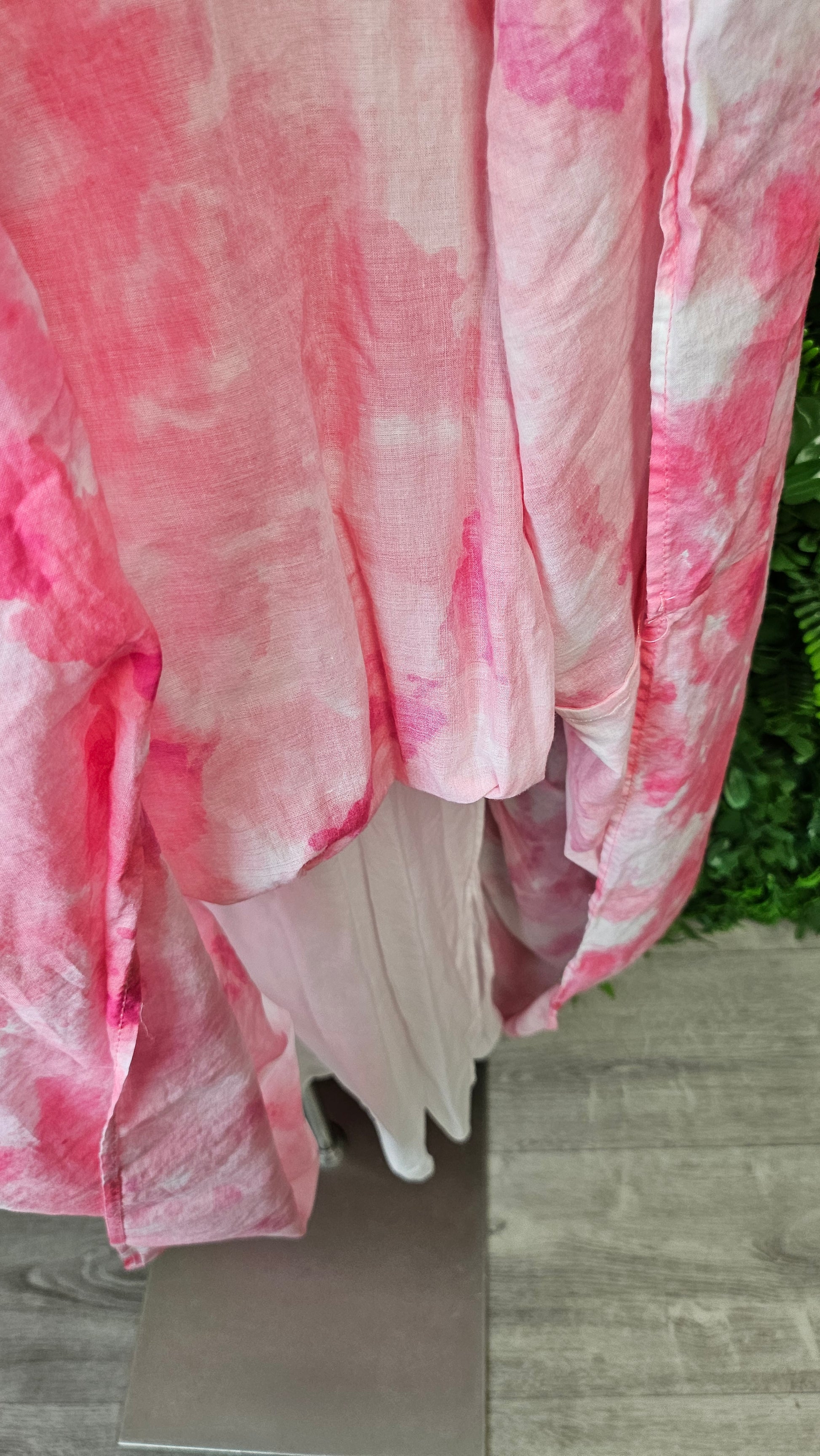 Tiered dress with fun water print in pink , fitted bodice with side zip, fully lined.